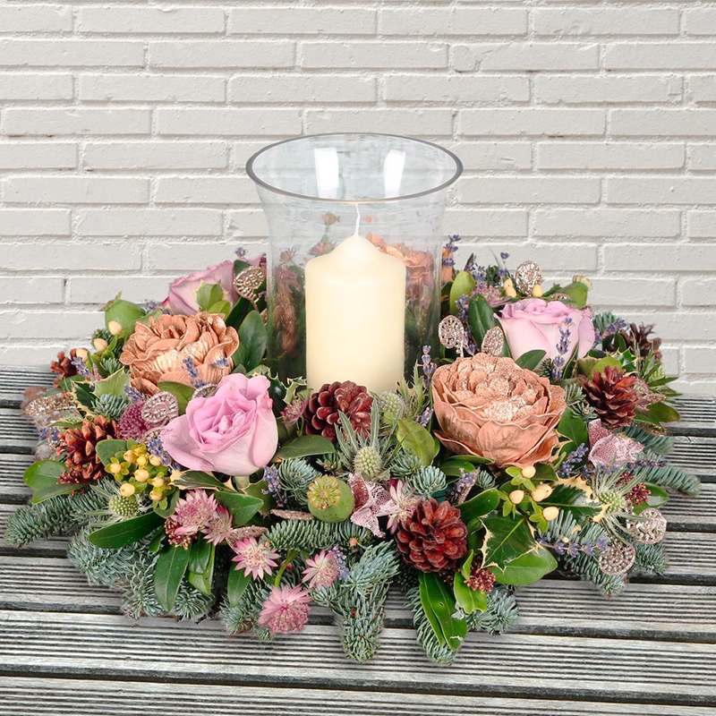 A elegant table arrangement with a hurricane vase and candle in the centre using soft pinks and rose gold shades.