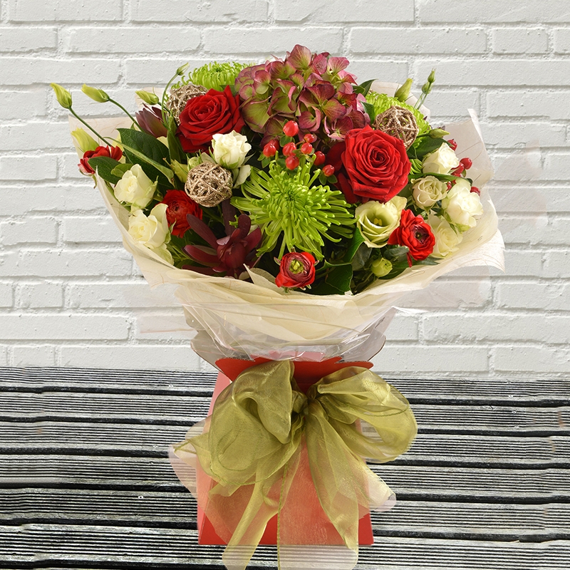 A handtied seasonal gift including reds, creams and green flowers and foliage.