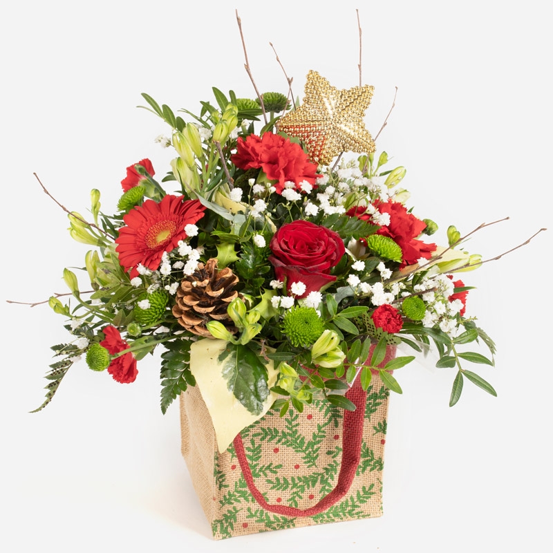 A lovely cute arrangement in a jute bag. A perfect christmas gift.